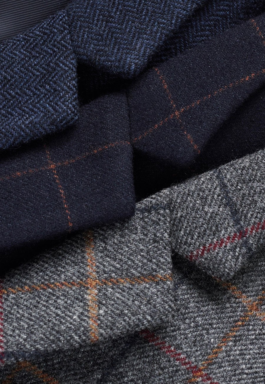 Notch lapel, 5 button front, 2 welt pockets, cloth back with vent detail and adjuster